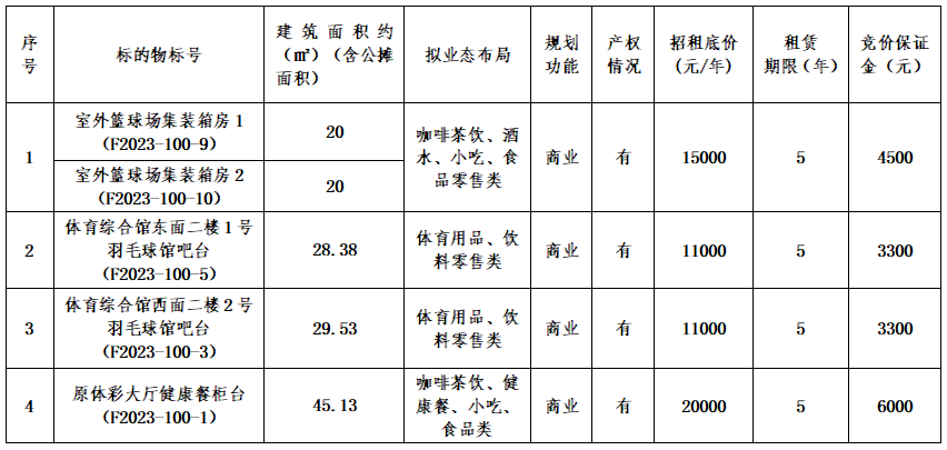 温州市龙湾区奥体中心室外篮球场集装箱房1、2及体育综合馆羽毛球馆吧台、原体彩大厅健康餐柜台等4宗商业用房租赁权拍卖公告(拍卖时间:2023年11月17日)