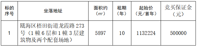 温州市瓯海区梧田街道龙霞路273号(1幢6层和1幢3层建筑物及两个配套场地)十年租赁权网络竞价公告(竞价时间:2024年5月15日)