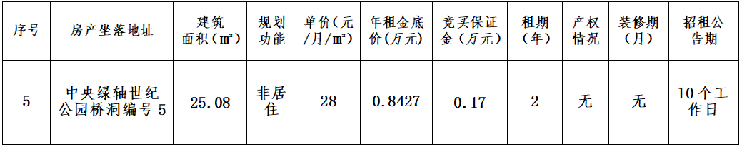 温州市瓯海区中央绿轴世纪公园桥洞编号5非居住用房两年租赁权(第二次)拍卖公告(拍卖时间:2024年11月26日)