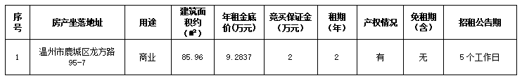 温州市鹿城区龙方路95-7商铺两年租赁权(第三次) 交易公告(交易时间:2025年10月16日)