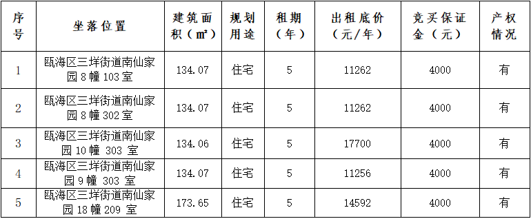 瓯海区三垟街道南仙家园5套房产五租赁权竞价公告(竞价时间:2025年10月29日)