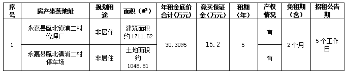 温州东瓯公交有限公司瓯北镇浦二村东瓯公司修理厂及停车场五年租赁权交易公告(交易时间:2025年12月3日)