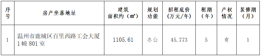受委托,定于2023年4月26日15时整,在温州开诚拍卖有限公司拍卖厅,对温州市鹿城区百里西路工会大厦1幢801室办公用房五年租赁权(第二次)进行增价式拍卖,具体拍卖事宜详见《竞买协议》及《房产租赁合同》(样本)。