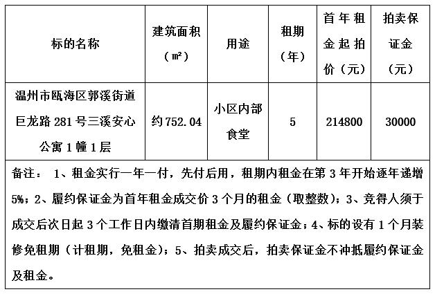 受委托,本公司对温州市瓯海区郭溪街道三溪安心公寓1幢1层房产租赁权进行公开拍卖,有关事项公告如下: