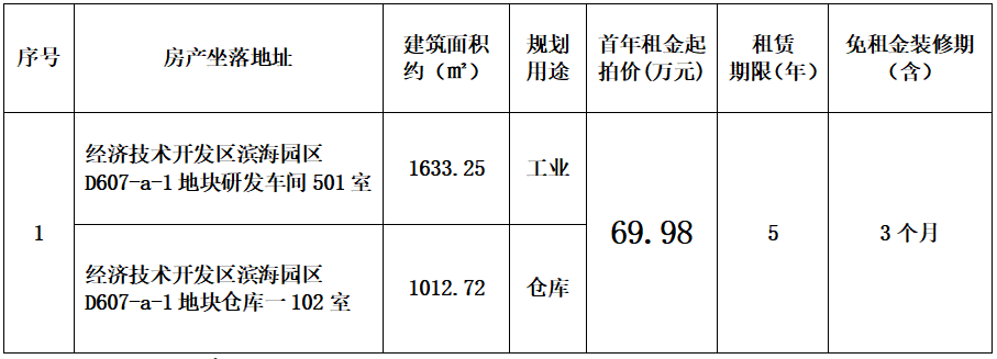 受委托,定于2023年8月17日15时整,在温州开诚拍卖有限公司拍卖厅,对温州市经开区滨海园区D607-a-1地块研发车间501室及仓库一102室工业用房整体五年租赁权进行增价式拍卖,具体拍卖事宜详见《竞买协议》及《房产租赁合同》(样本)。